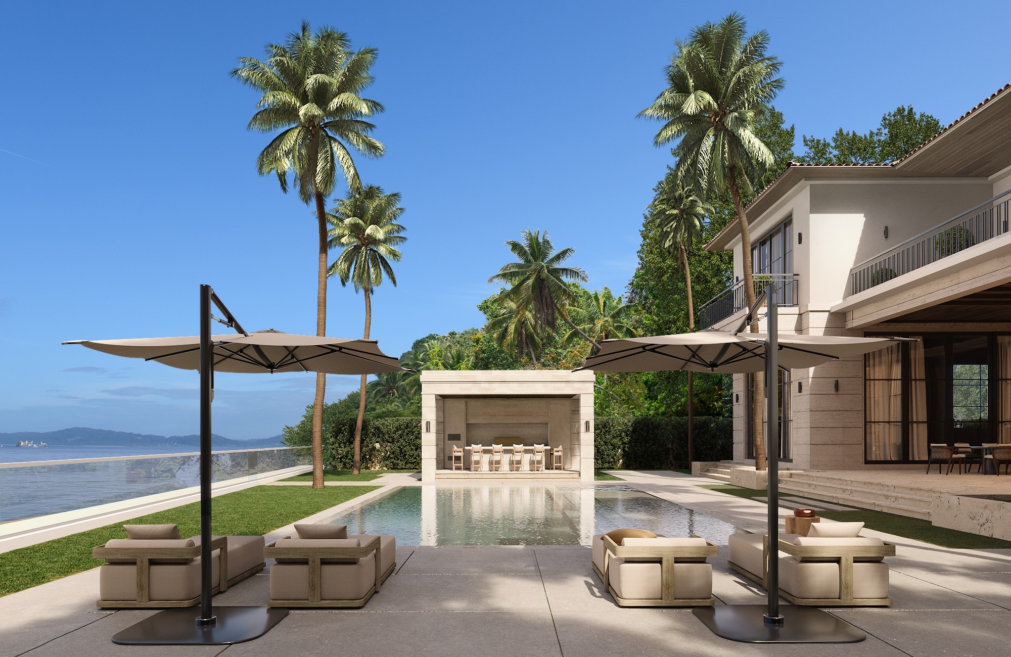 The living room opens to the waterfront with a sunken seating area that preserves uninterrupted views of the pool and bay.