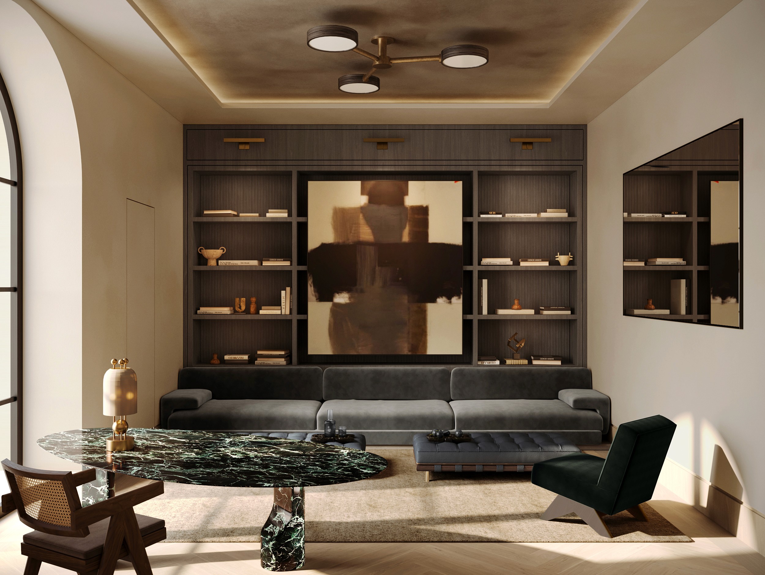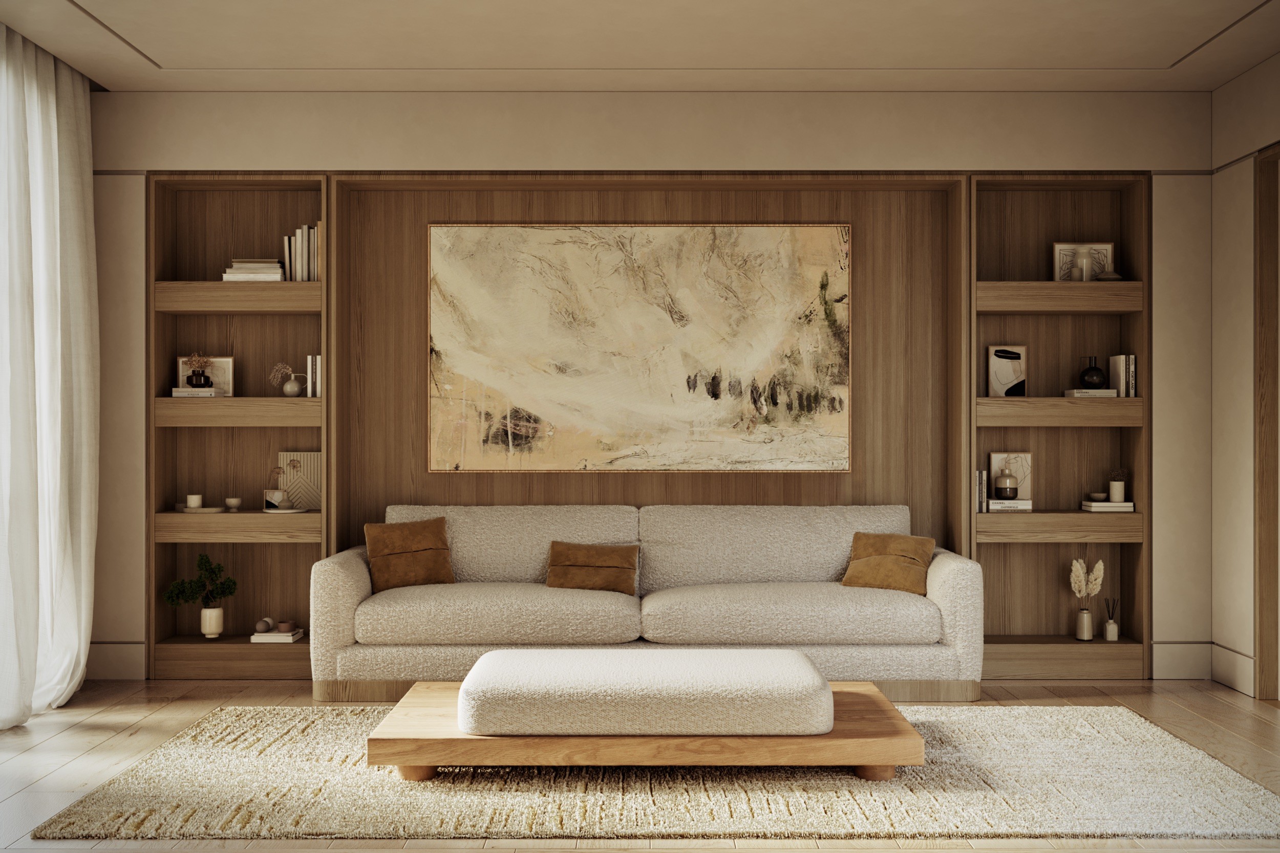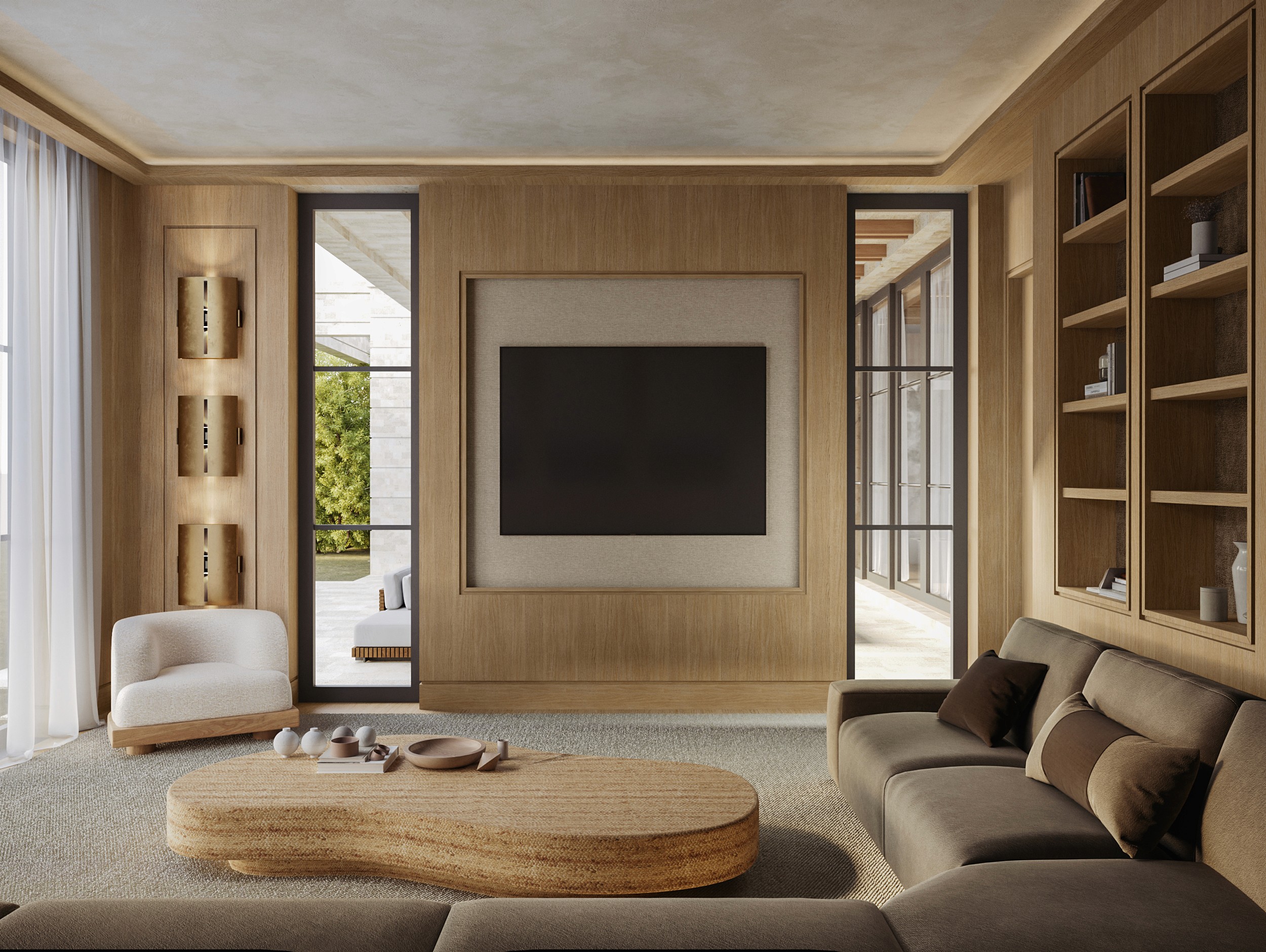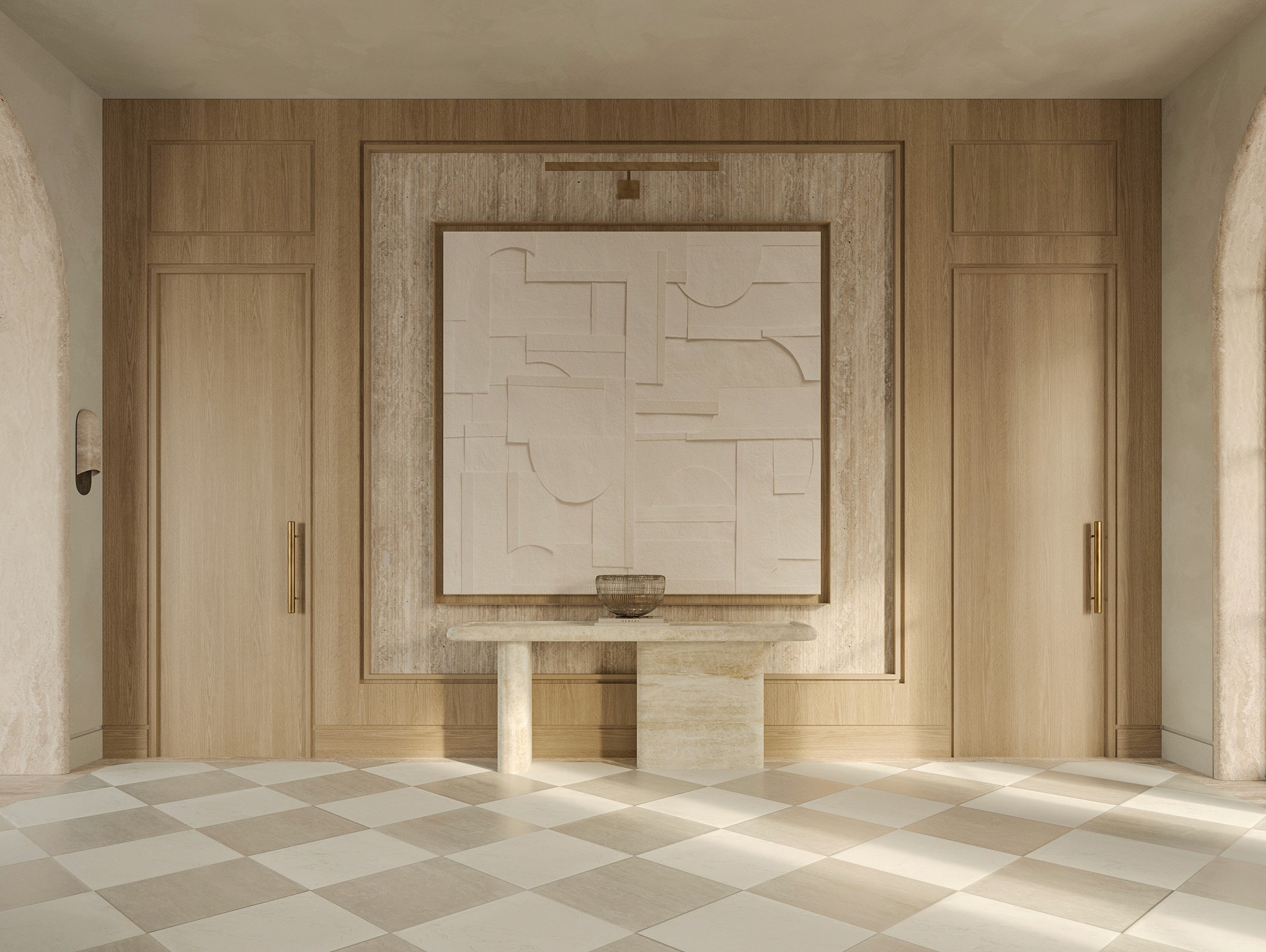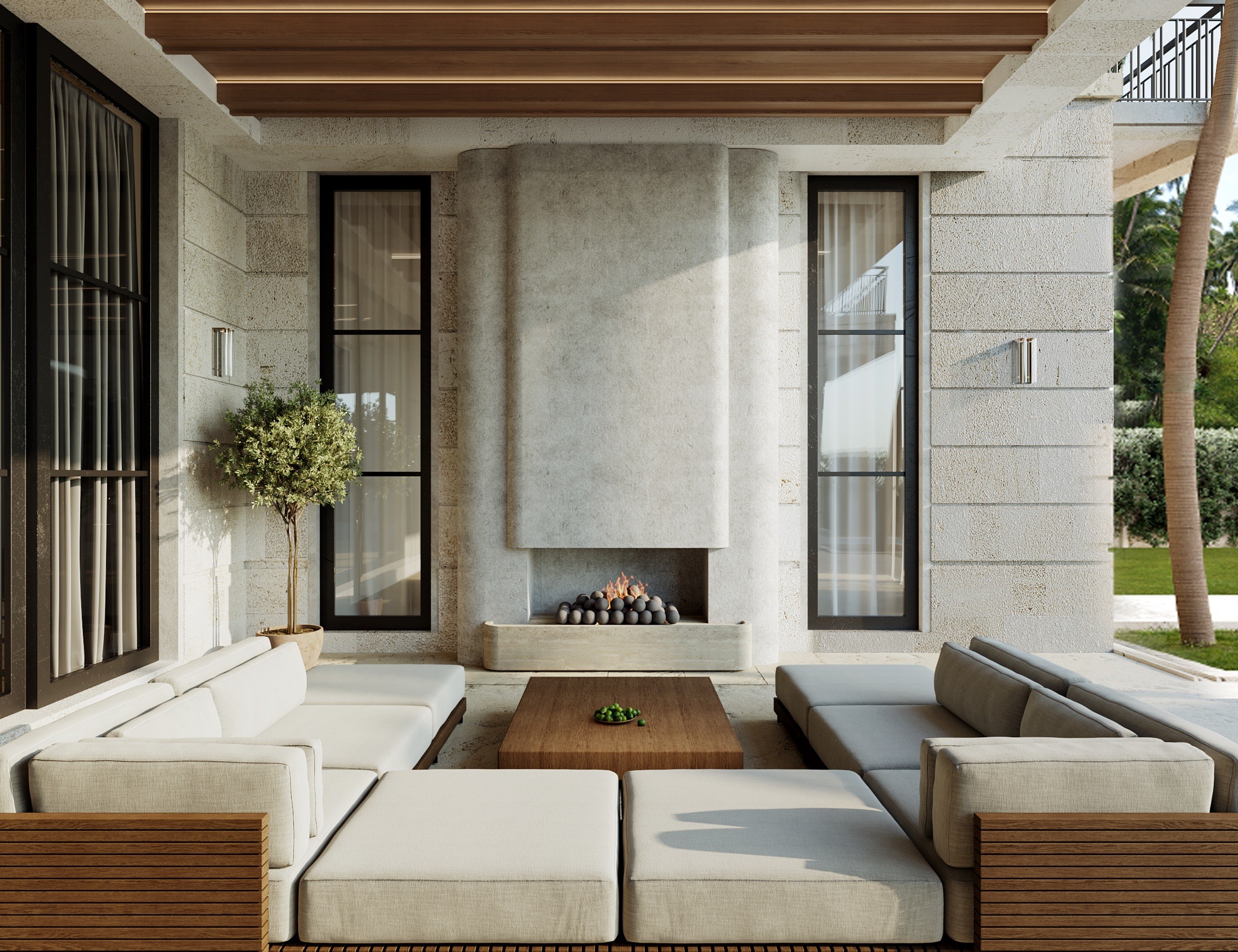 Inside, travertine continues from exterior to interior, maintaining material continuity. A sculptural wood spiral staircase marks the entry.