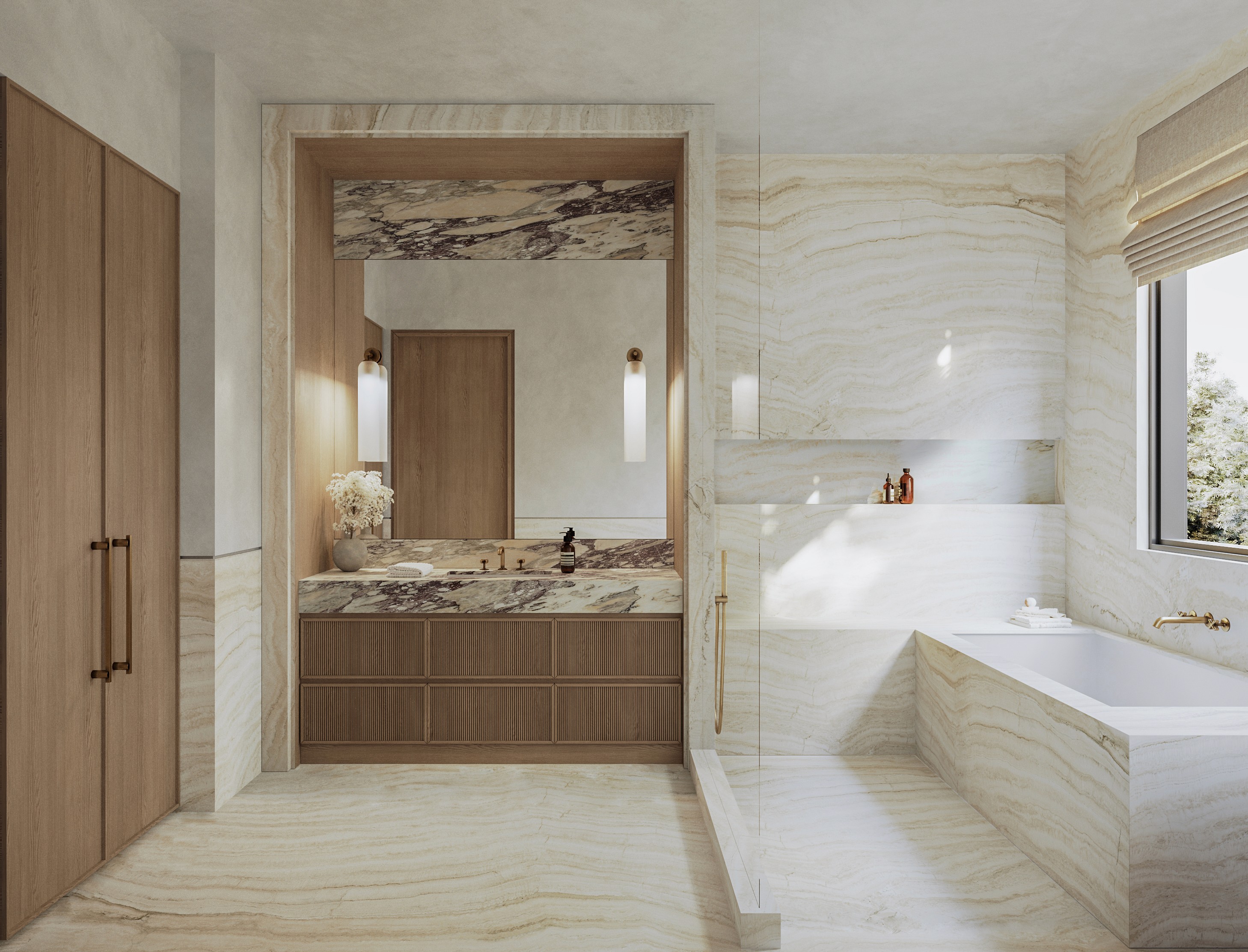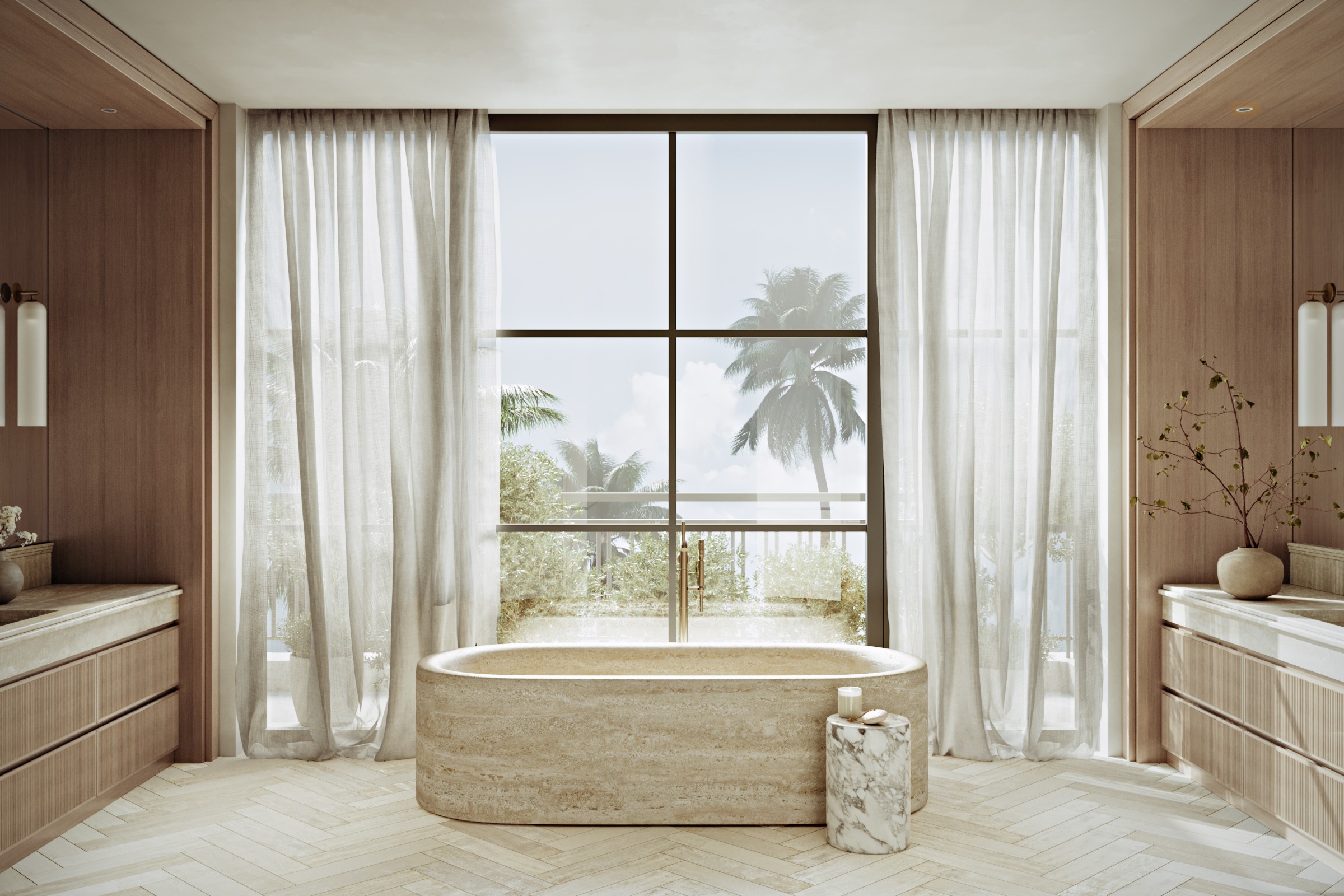 The primary suite faces the water, with an onyx-clad bathroom and sculptural tub. A quieter office finished in greyed oak provides contrast to the open living areas.