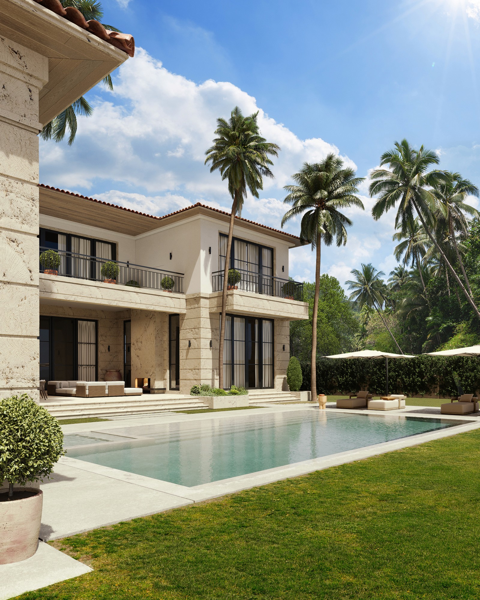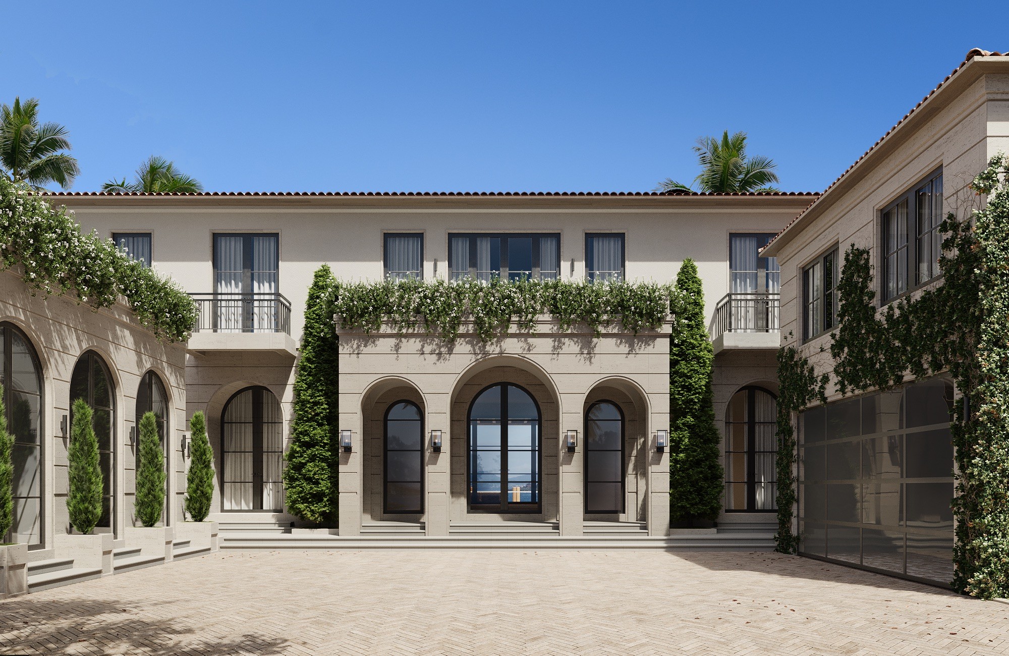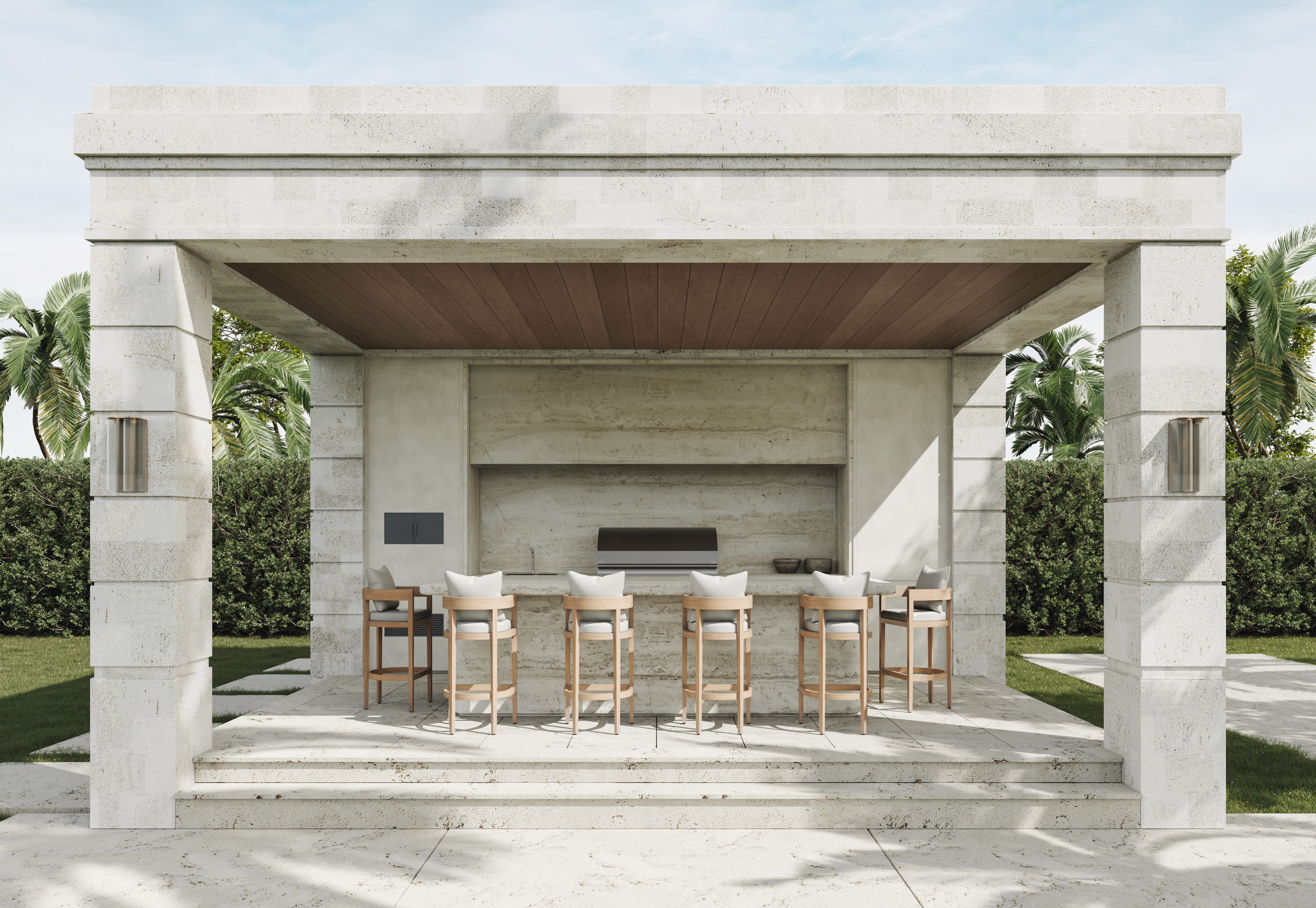 The two-story home features a travertine façade with arches that create rhythm and depth. Above, smooth stucco adds contrast and lightness. Separate structures including a guest house, gym, and pool cabana frame the property.