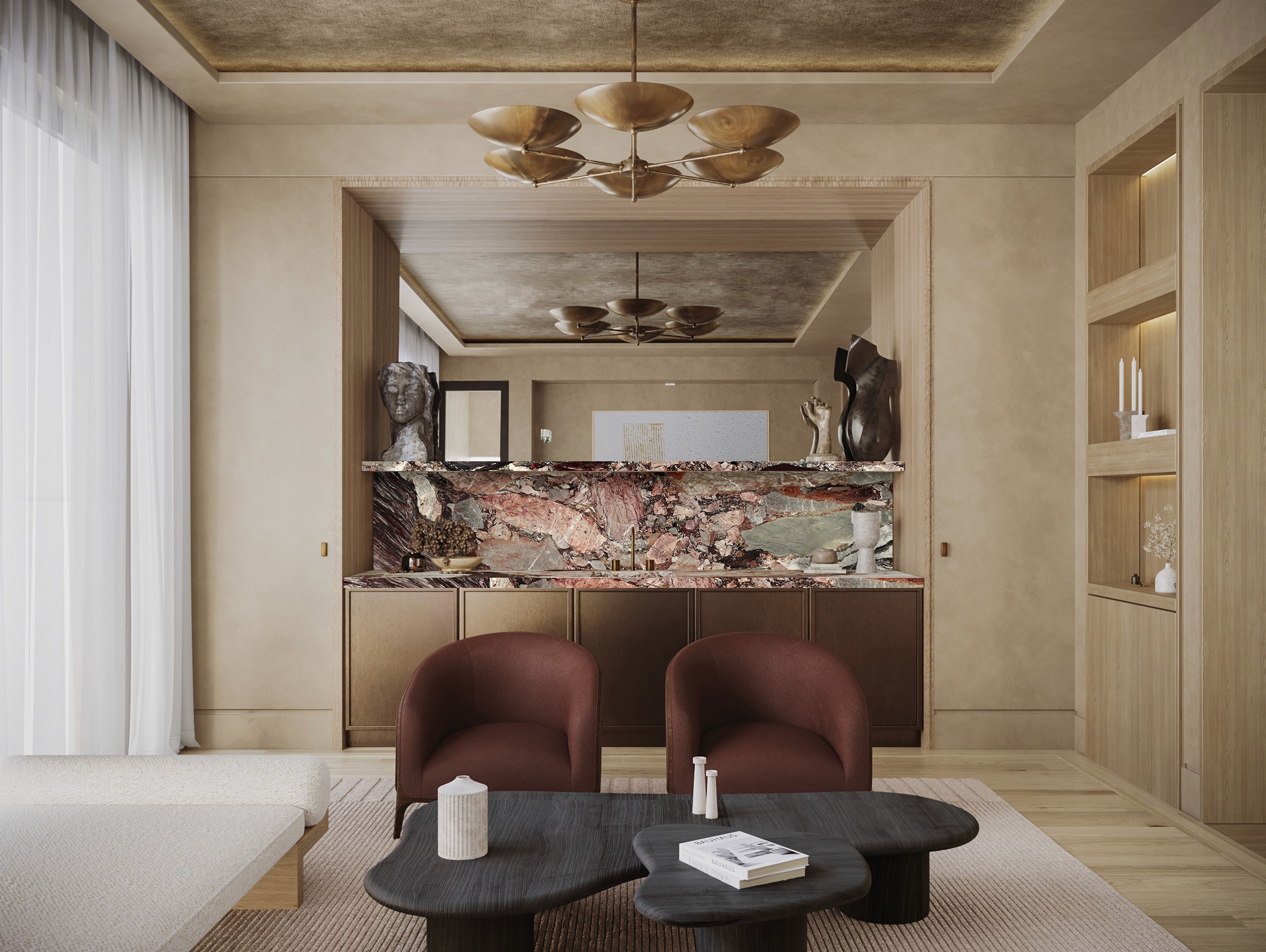 The kitchen and bar sit opposite, forming a continuous flow of space. Wood paneling conceals cabinetry, while a Taj Mahal island becomes the focal point.